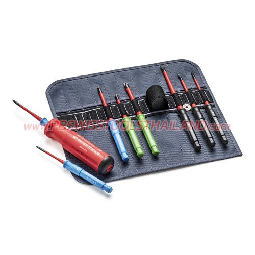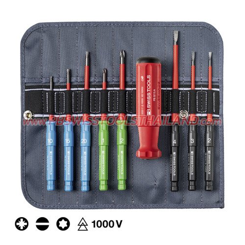 PB5218SU ชุดไขควงเปลี่ยนหัวได้ 9 ตัวชุด (รวมด้าม) ใช้กับหัวแบน-PZ-ทอร์ค พร้อมซองหนัง สำหรับงานไฟฟ้า VDE1000V หรือกระแสตรง 1500V PB SWISS TOOLS